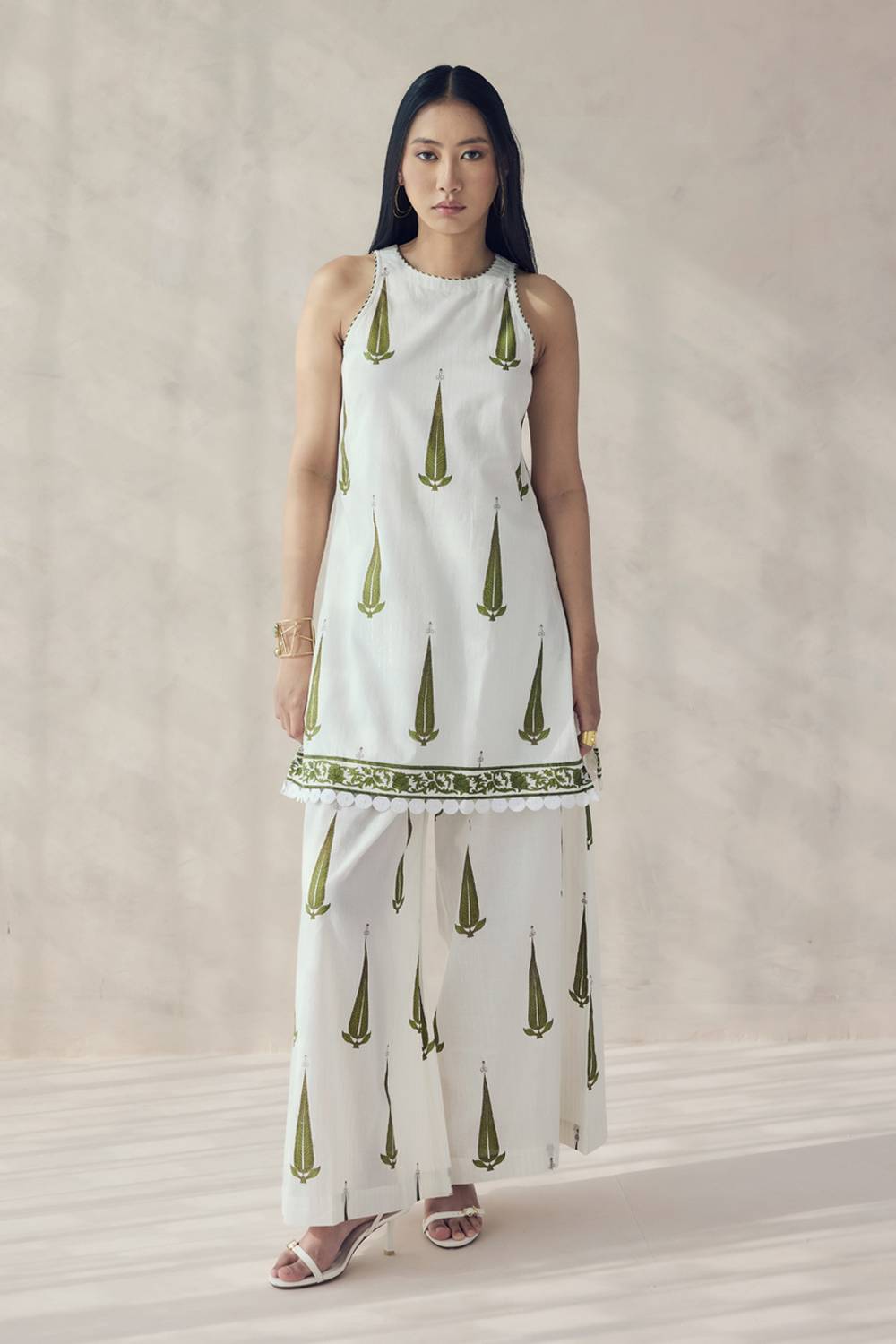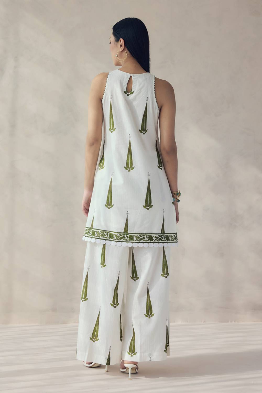 Off White Printed Cotton Kurti Pant Set