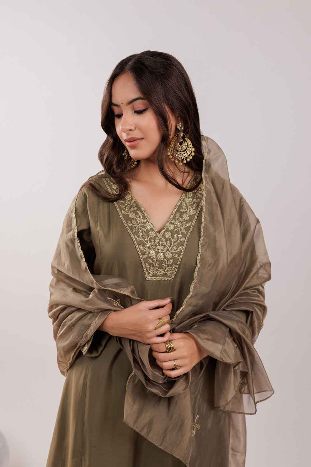 Olive Embroidered Silk Kurti Pant Set