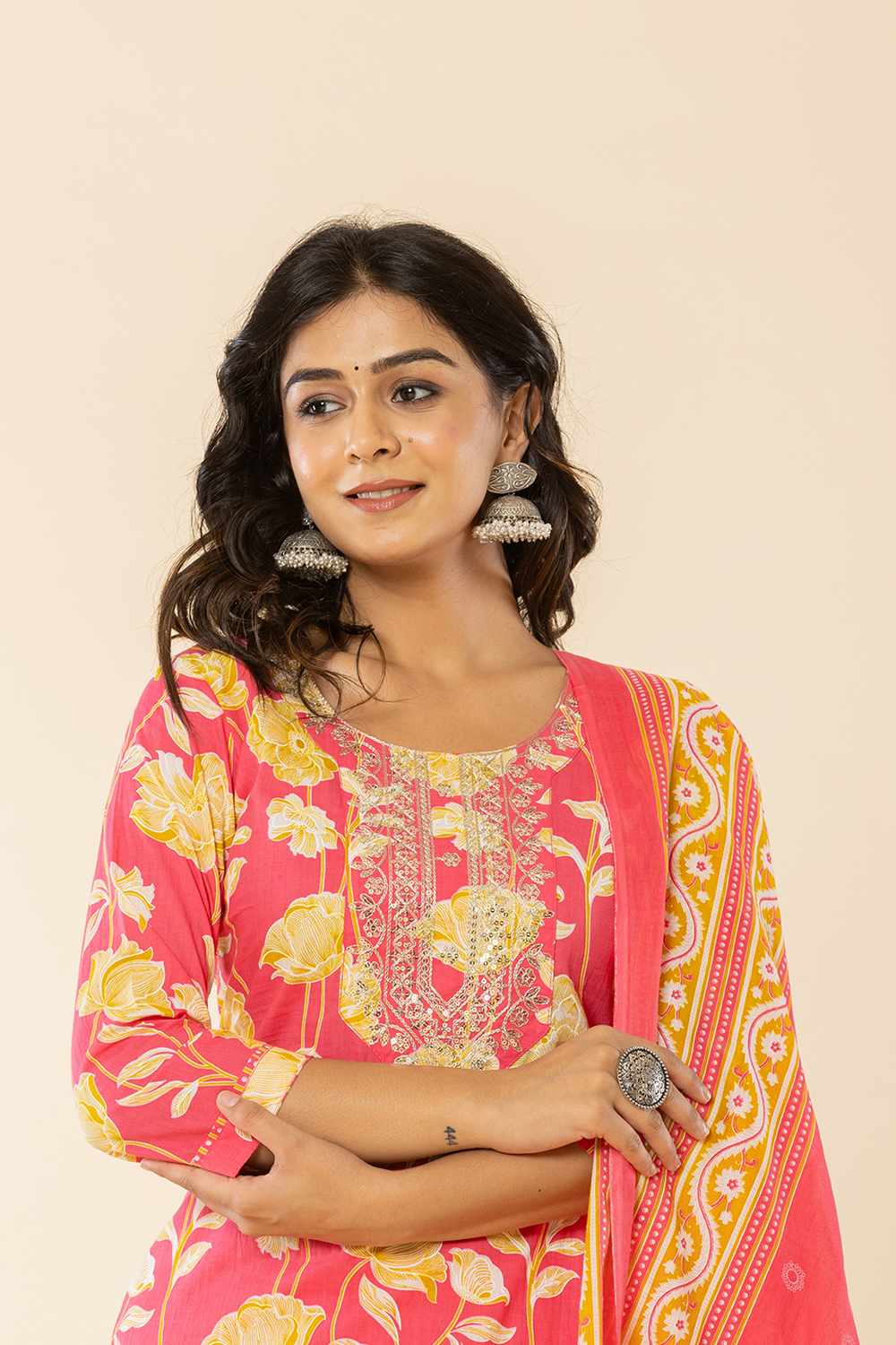 Stay stylish and comfortable with our Kurti Pant Set designed for all-day elegance. Made with Cotton this set is perfect for easy movement and timeless appeal. The beautiful and intricate Floral print elevates its design for Casual or daily wear, this kurti set is your go-to outfit. Pair it with elegant earrings and kolhapuri sandals or heels for a traditional look or wedges for a modern edge