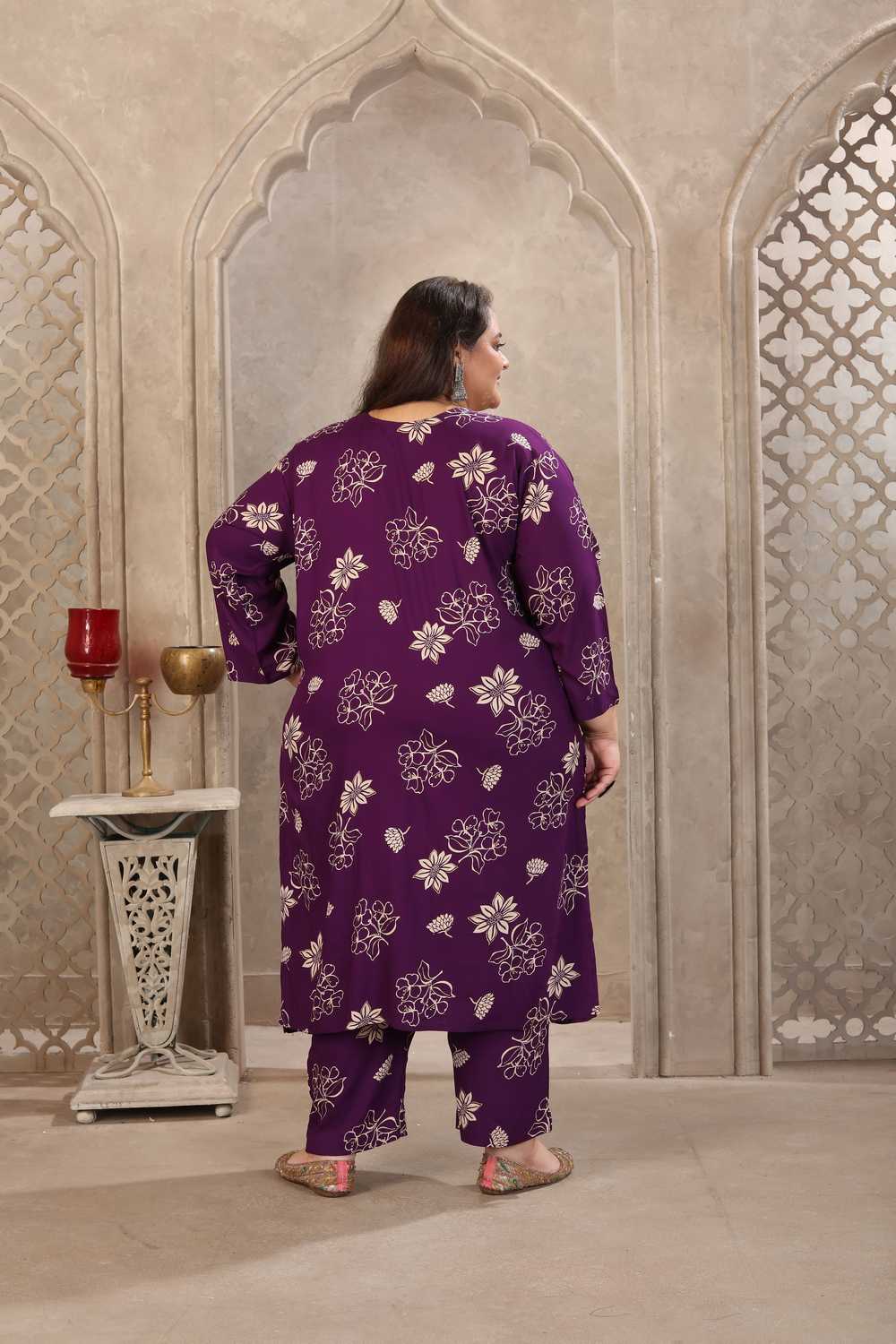 Purple Floral Printed Rayon Straight Cut Suit Set
