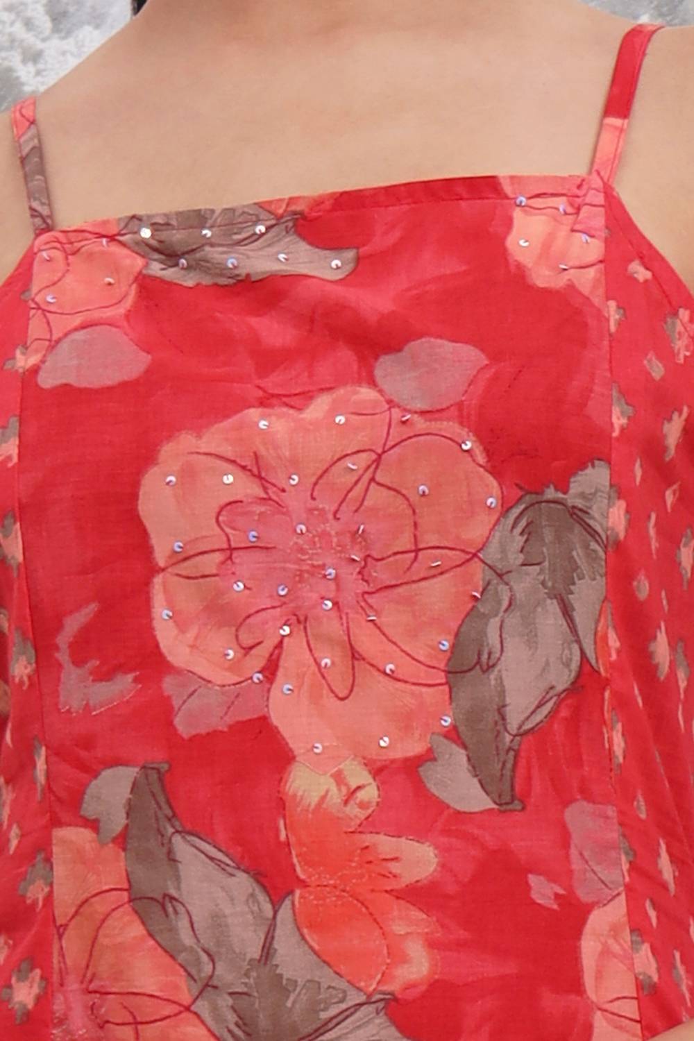 Red Floral Printed Cotton Straight Cut Suit Set