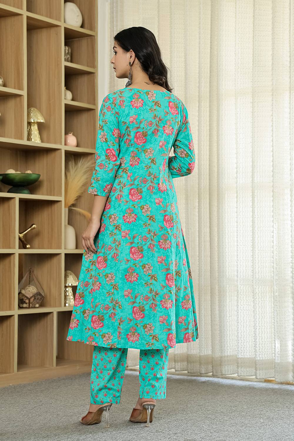 Sea Green Floral Printed Cotton Straight Cut Suit Set