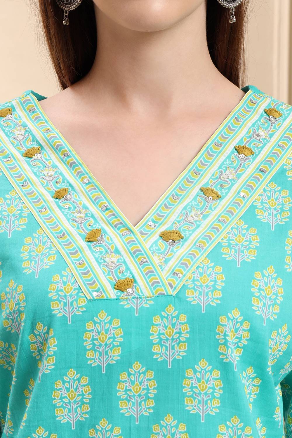 Sea Green Floral Printed Cotton Straight Cut Suit Set