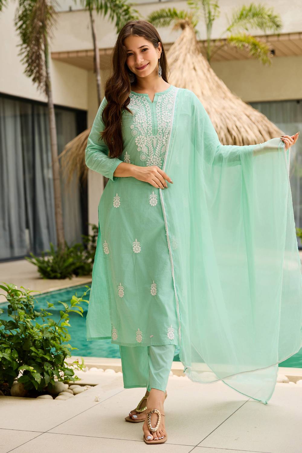 Turquoise Floral Embroidered Cotton Kurti Pant Set