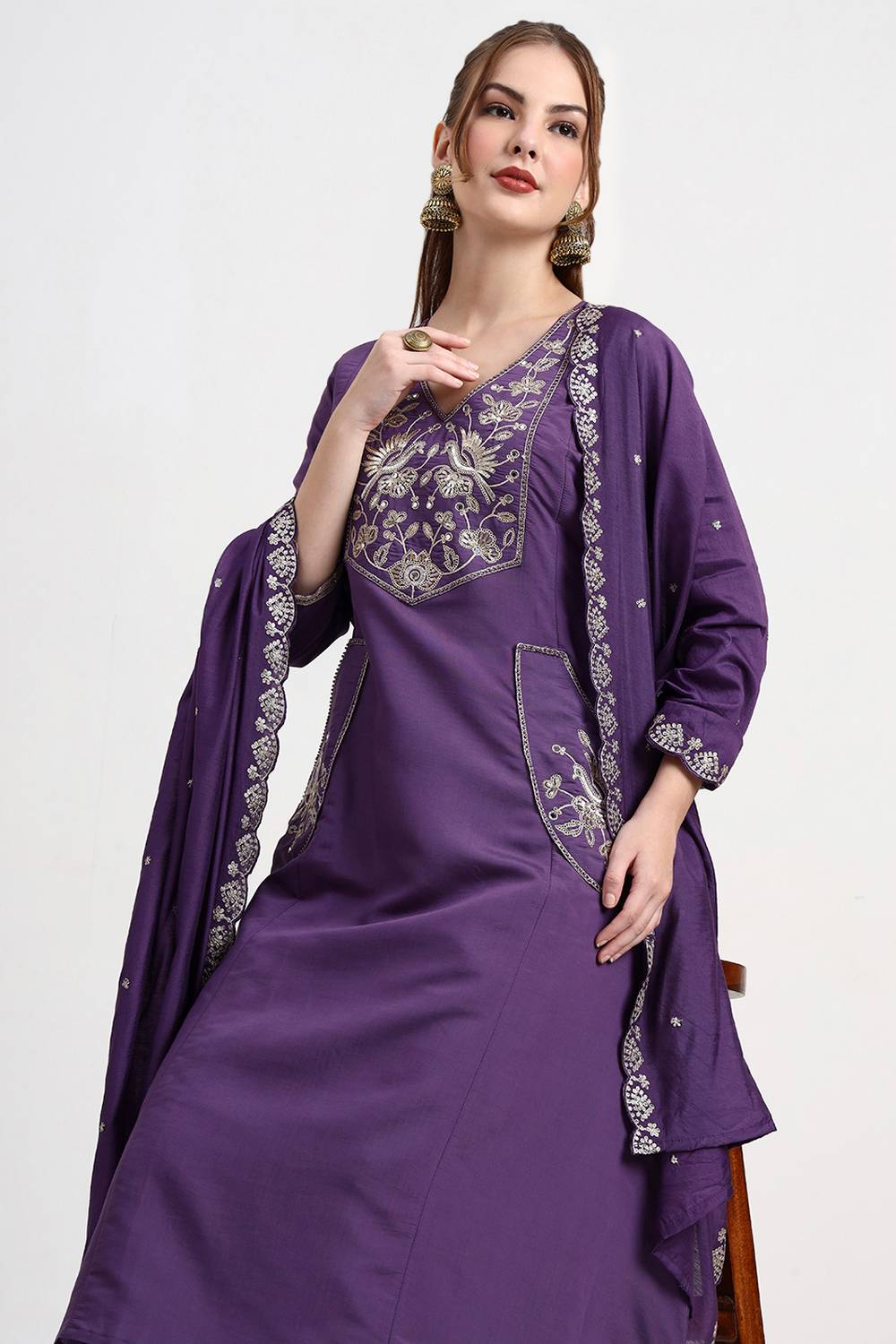 Violet Embroidered Silk Palazzo Suit Set