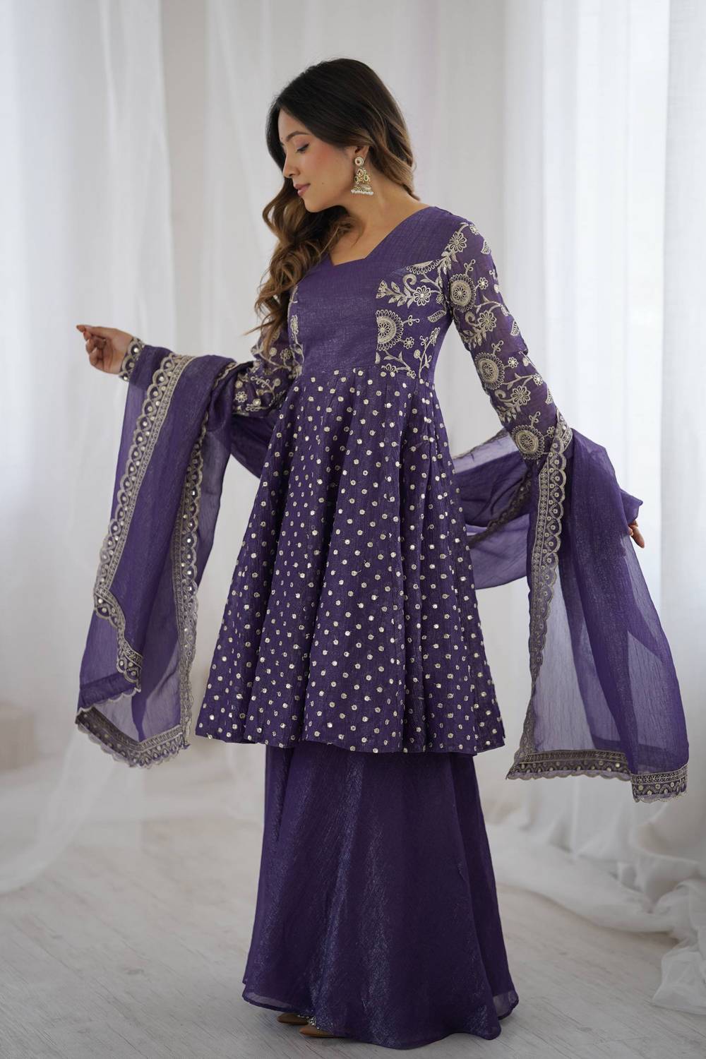 Step into effortless style with our Sharara Suits crafted for the modern woman who cherishes tradition. Made from soft Silk it keeps you comfortable all day long. The Floral Embroidered design lends a touch of sophistication to your outfit. Perfect for Party, Sangeet, Mehendi this is a must-have for versatile styling options. Style it with minimalistic accessories and flats for a casual look or jewelry and heels for special events