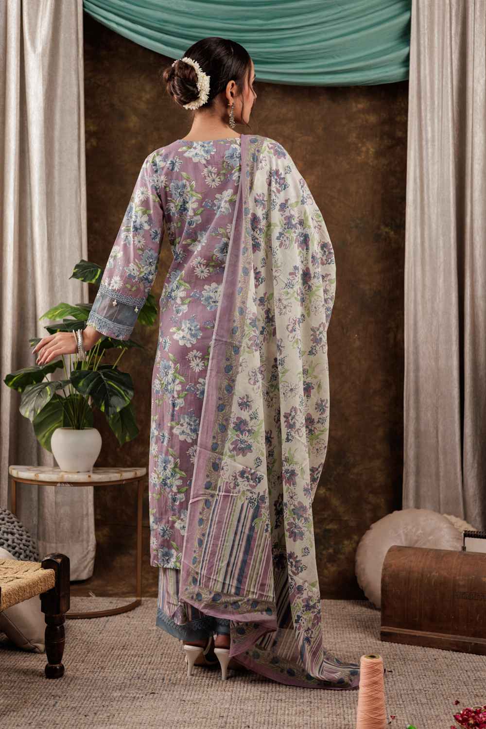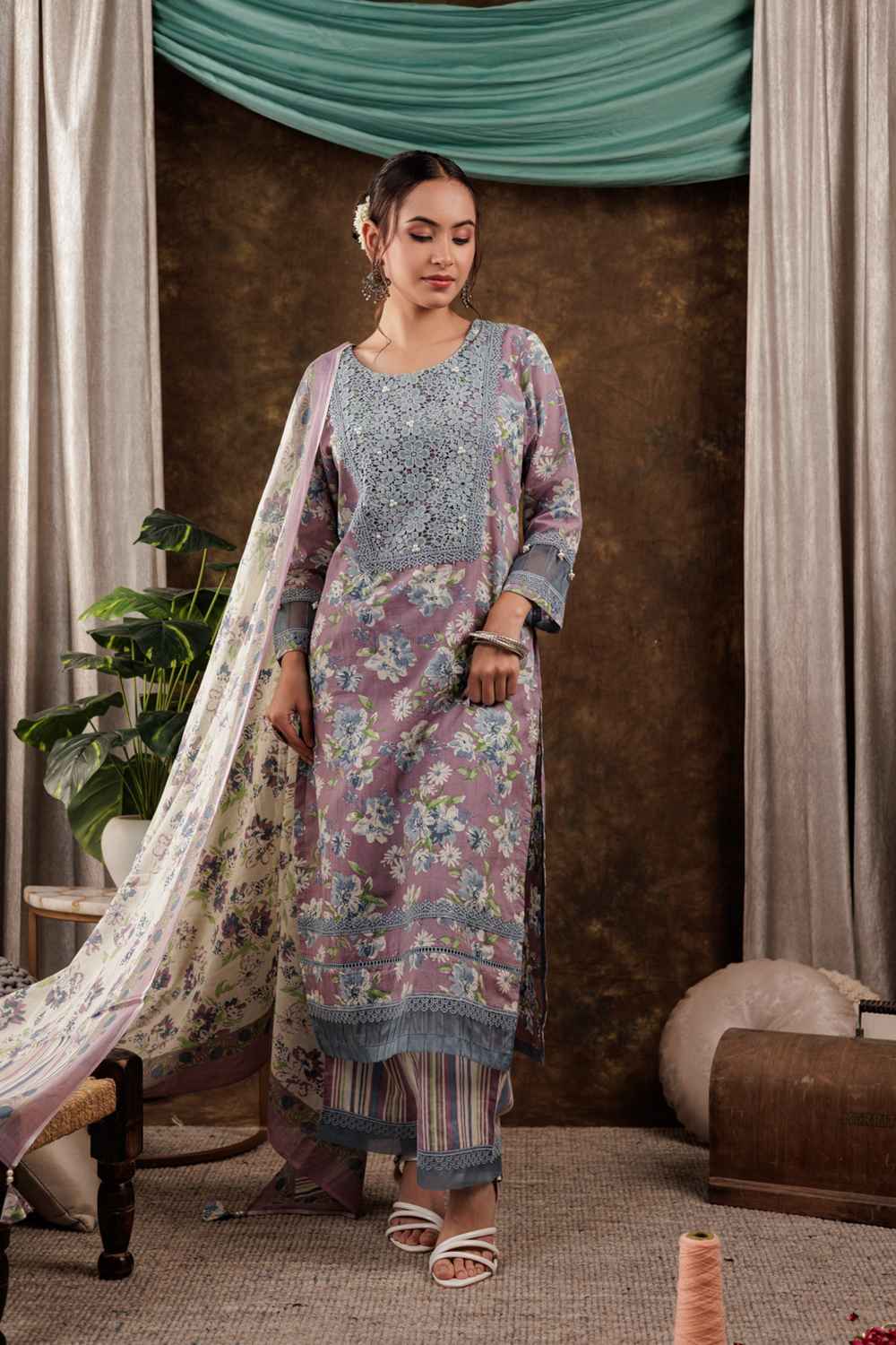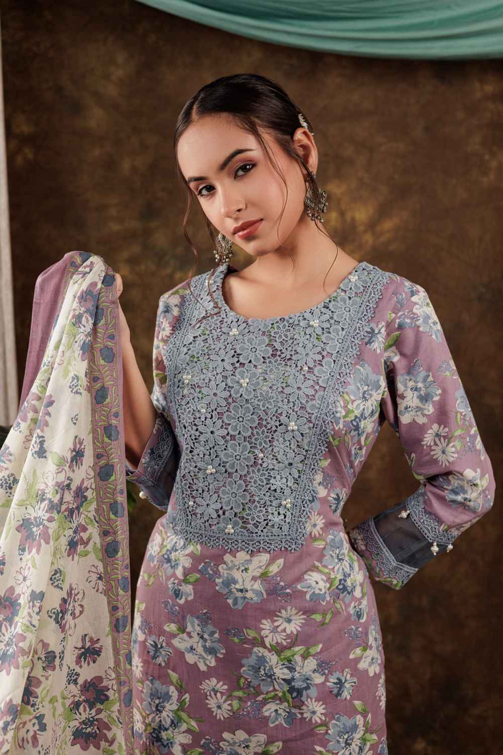 Violet Floral Print Beads and Stones Embossed Pure Cotton Kurti Pant Set