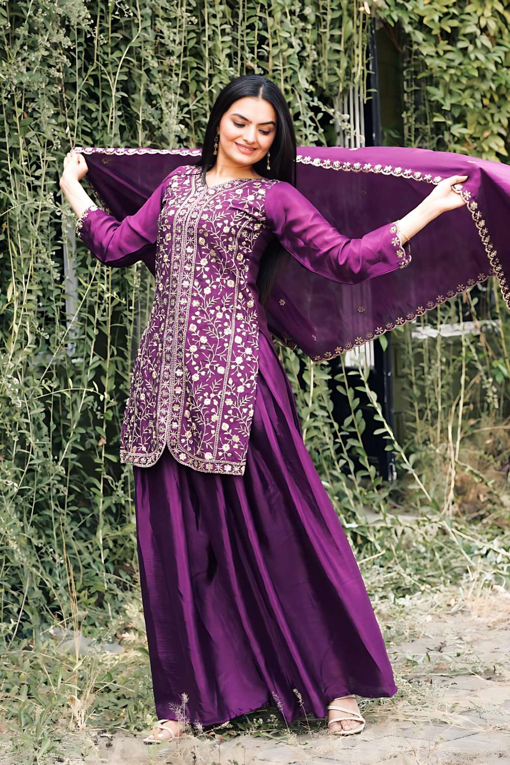 Wine Sequin with Embroidered Chinon Sharara Suit Set