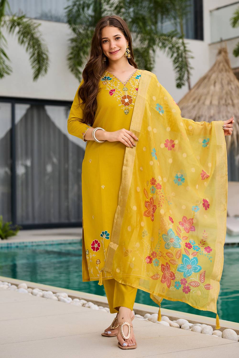 Yellow Floral Embroidered Viscose Straight Cut Suit Set