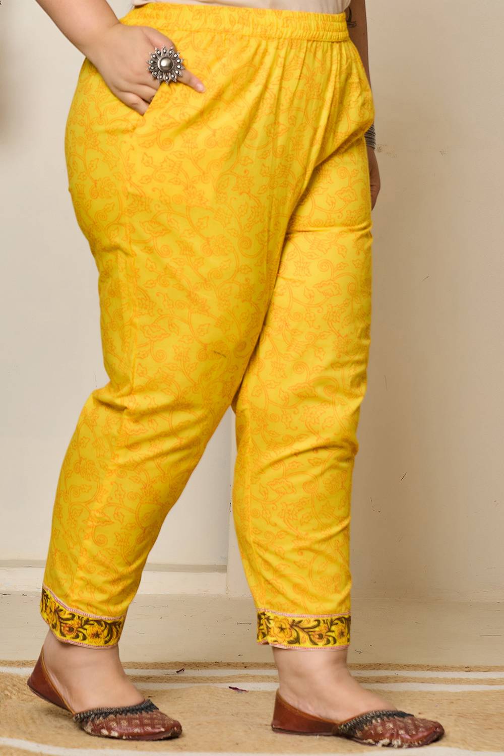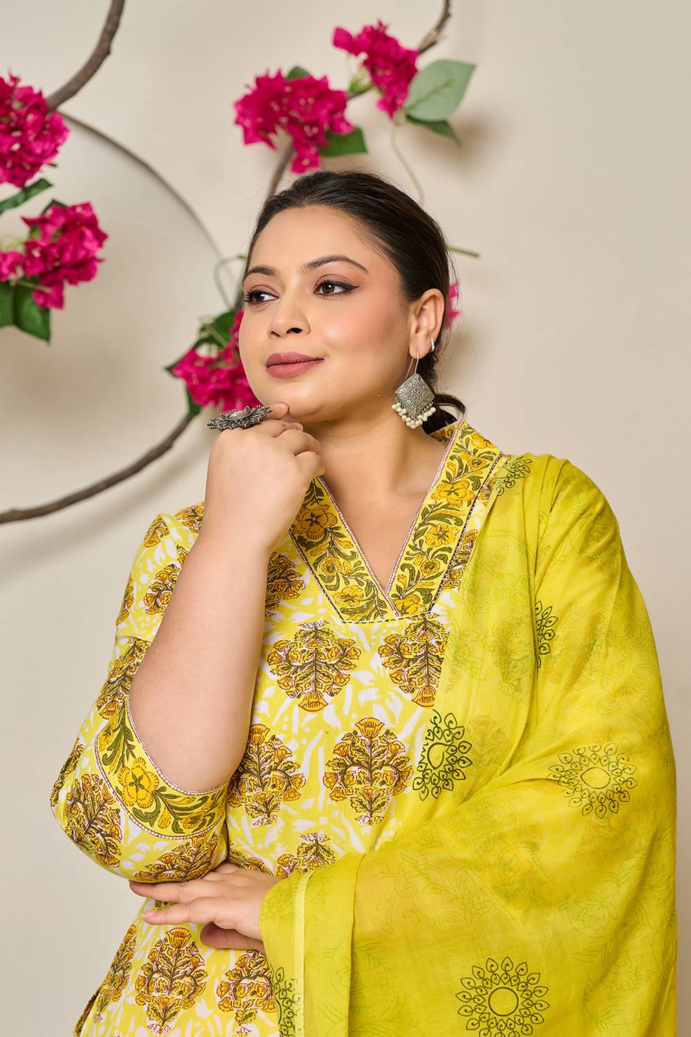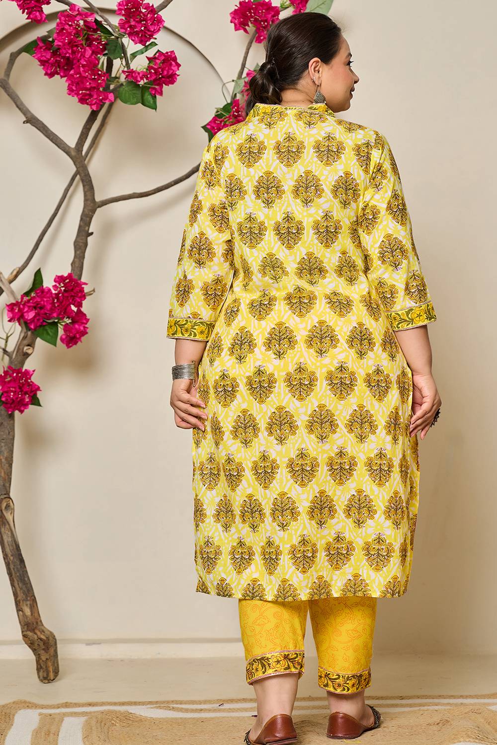 Yellow Floral Printed Cotton Straight Cut Suit Set