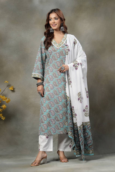 Blue Paisley Printed Cotton Straight Cut Suit Set