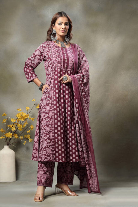Violet Floral Printed Cotton Straight Cut Suit Set