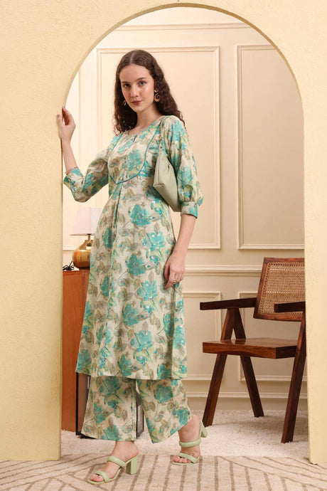 Sea Green Floral Printed Linen Straight Cut Suit Set