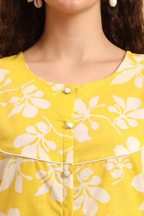 Yellow Floral Printed Cotton Straight Cut Suit Set