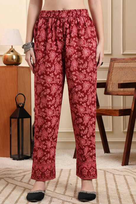 Maroon Floral Printed Cotton Straight Cut Suit Set