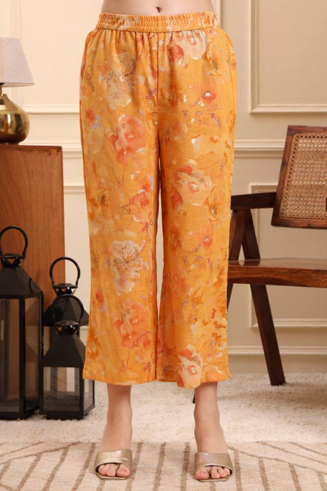 Mustard Floral Printed Linen Straight Cut Suit Set