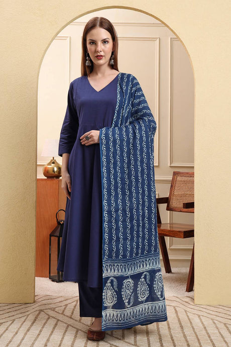 Blue Floral Printed Cotton Straight Cut Suit Set
