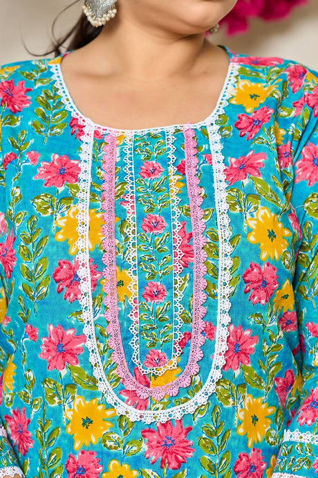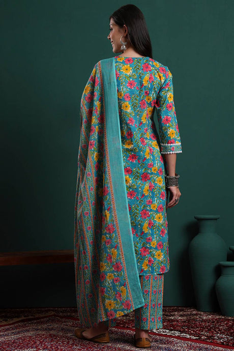 Turquoise Floral Printed Cotton Straight Cut Suit Set