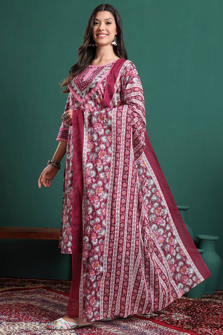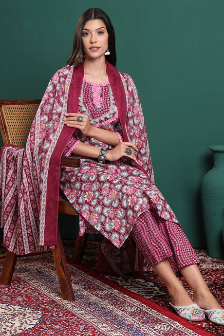 Dark Pink Floral Printed Cotton Straight Cut Suit Set