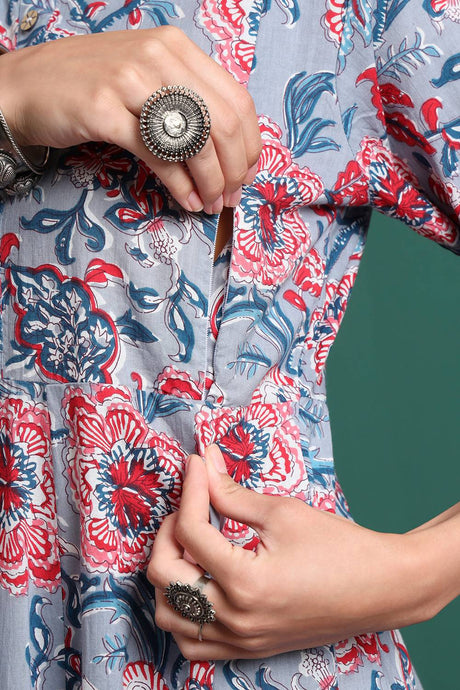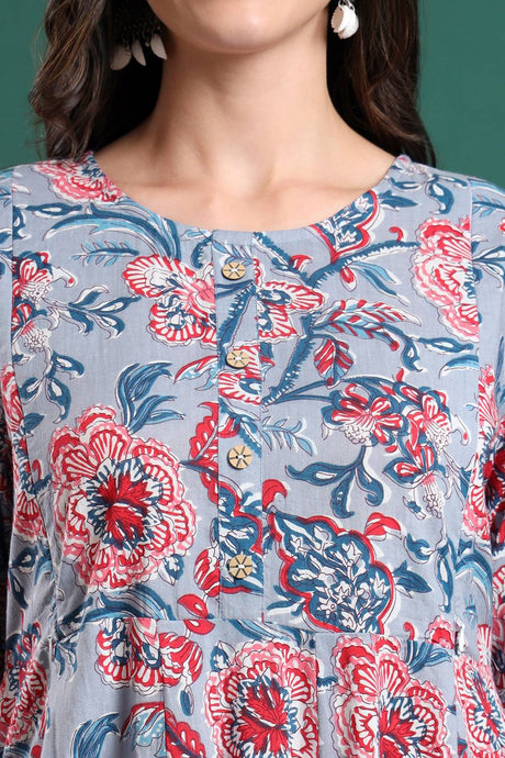 Grey Floral Printed Cotton Straight Cut Suit Set