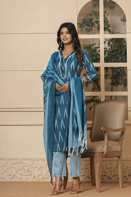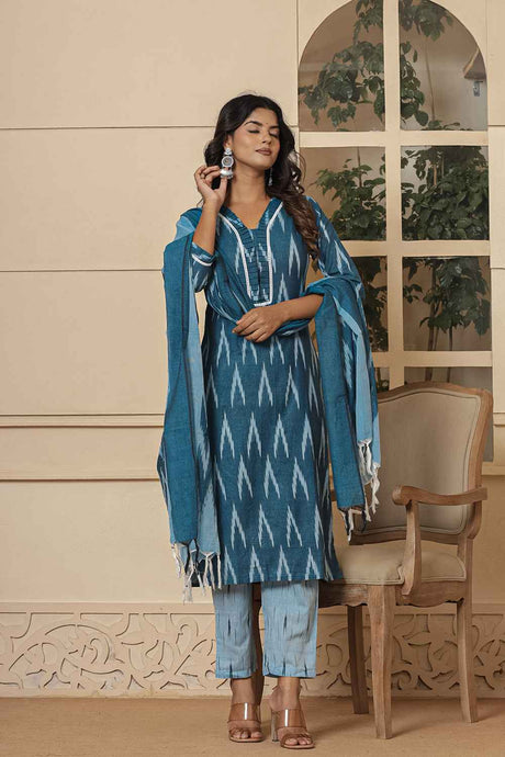 Blue Ikat Print Pure Cotton Kurti Pant Set