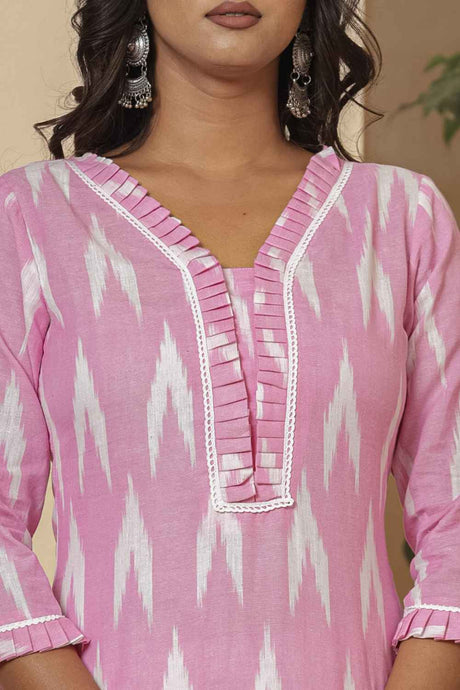 Pink Ikat Print Pure Cotton Kurti Pant Set