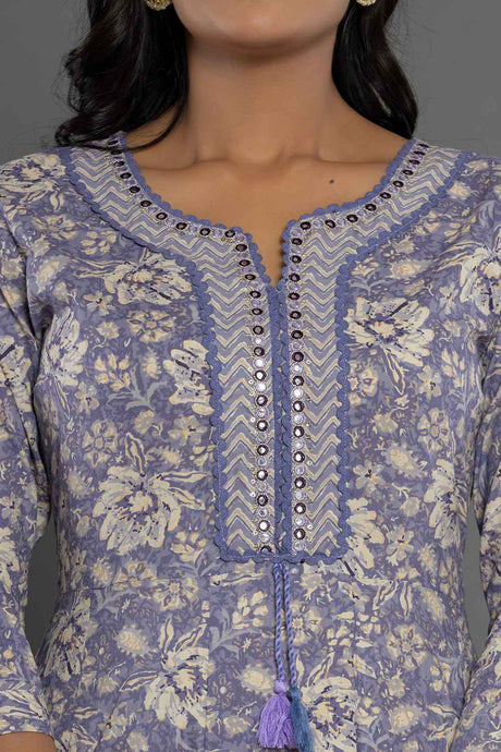 Violet Floral Print Mirror Work?¨ Pure Cotton Kurti Pant Set