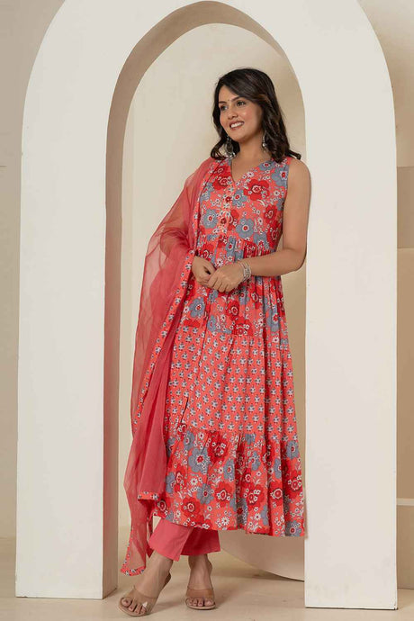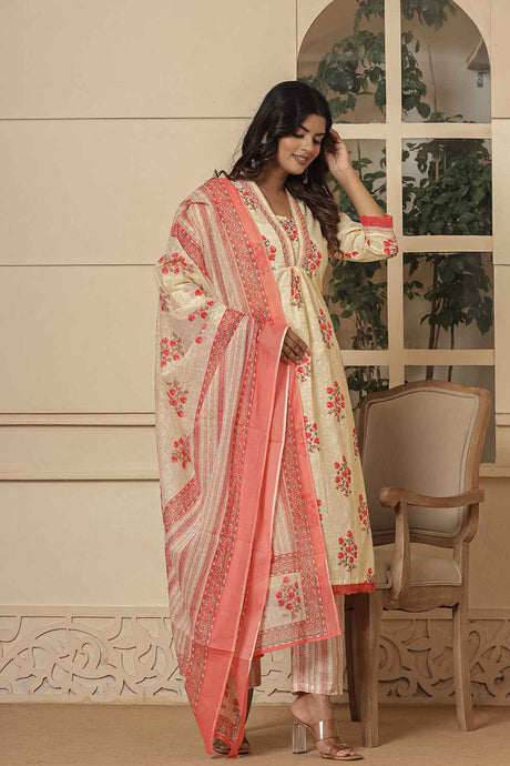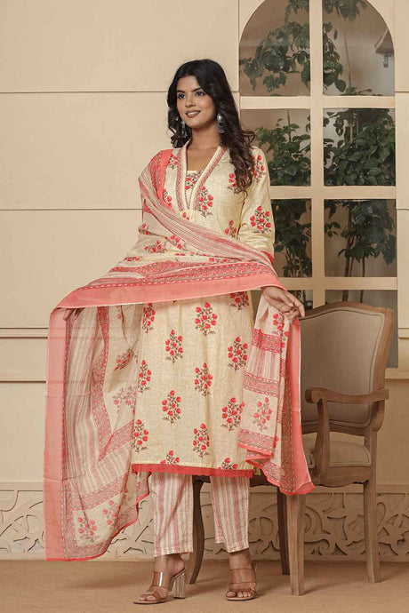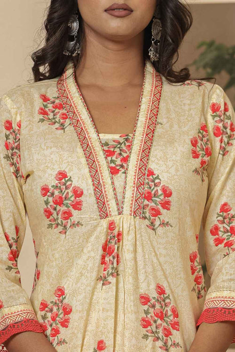 Pink Floral Print Beads and Stones Embossed Pure Cotton Kurti Pant Set