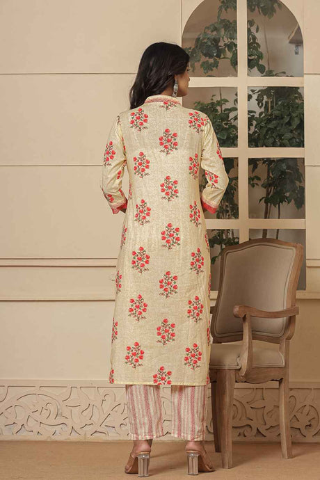 Yellow Ethnic Motifs Beads and Stones Embossed Pure Cotton Kurti Pant Set