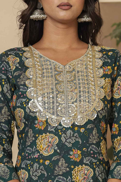 Green Floral Print Sequins Work Pure Cotton Kurti Pant Set