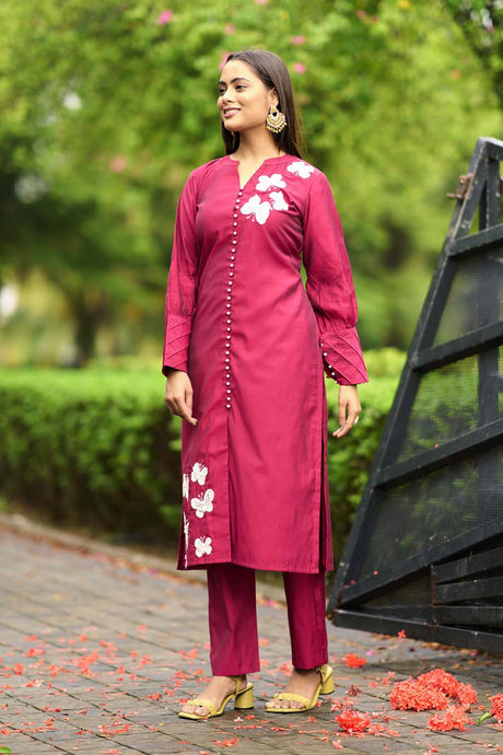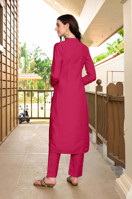 Dark-Pink Hand Embroidery Art Silk Straight Cut Kurti Pants Set