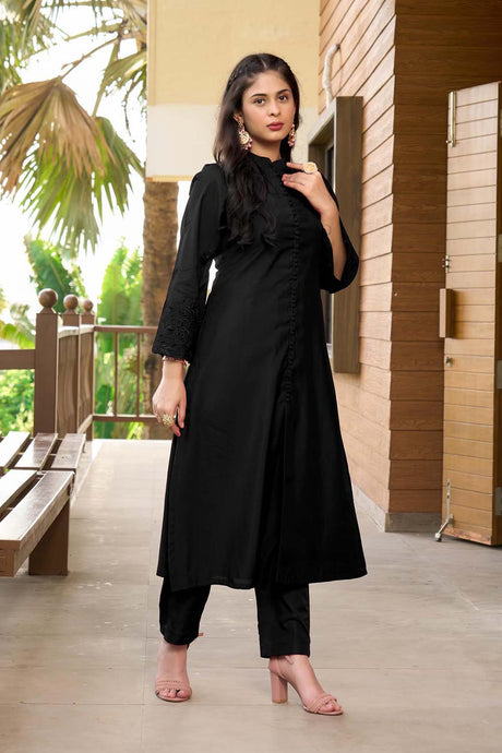 Black Hand Embroidery Art Silk Straight Cut Pants Kurti Set