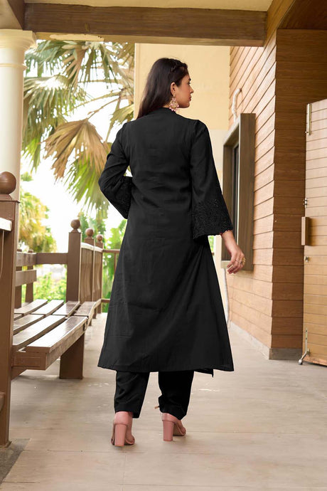 Black Hand Embroidery Art Silk A Line Pants Kurti Set