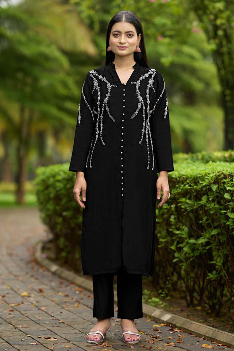 Black Hand Embroidery Art Silk Straight Cut Kurti Pants Set