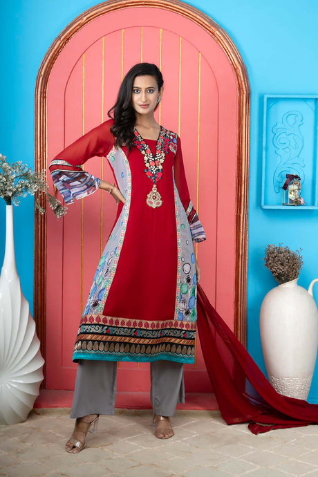 Maroon Georgette Stitched Straight Cut Trouser Kurti Dupatta Readymade Suits