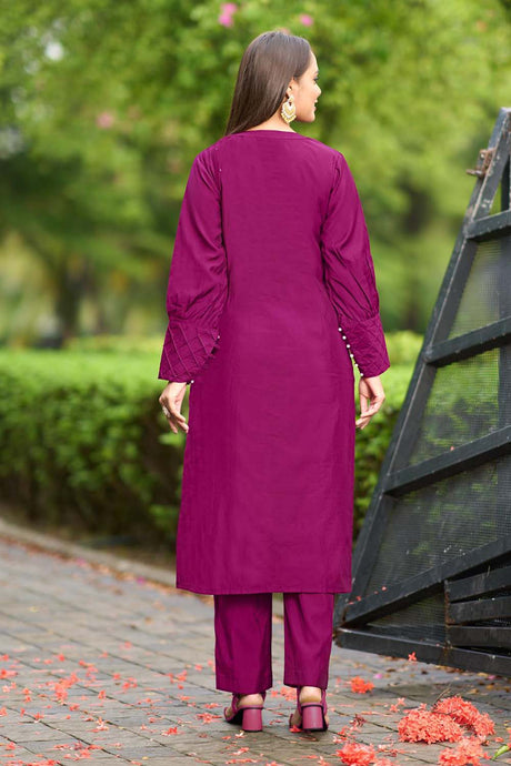 Dark-Pink Hand Embroidery Art Silk Straight Cut Suit Set