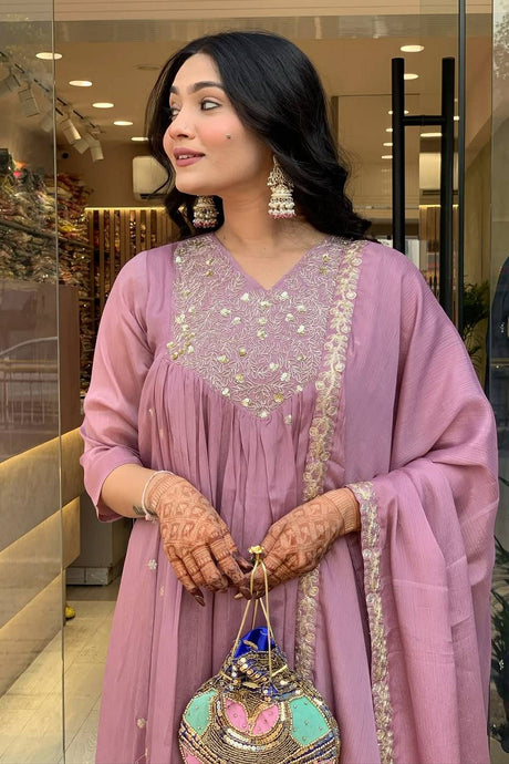 Violet Floral Embroidered Chanderi Anarkali Suits