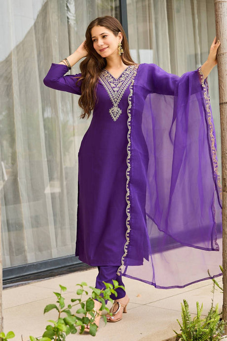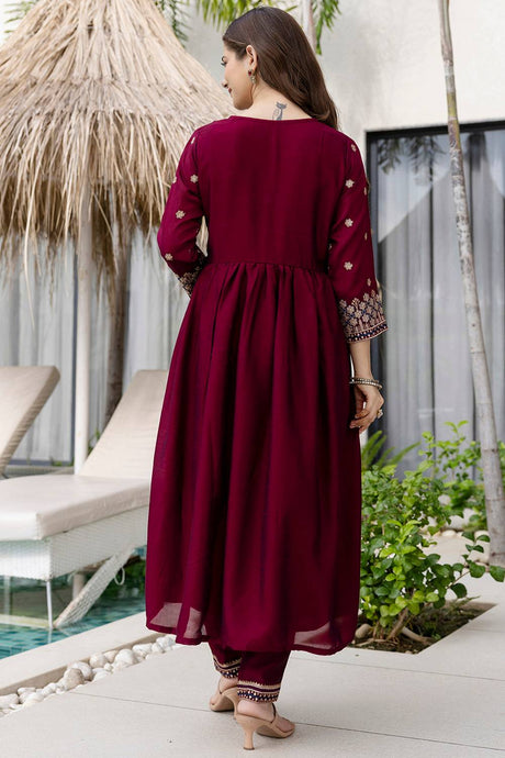 Wine Floral Embroidered Chanderi Straight Cut Suit Set