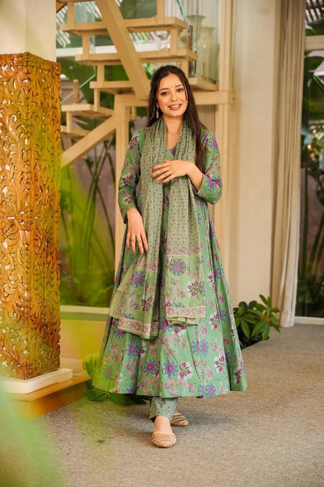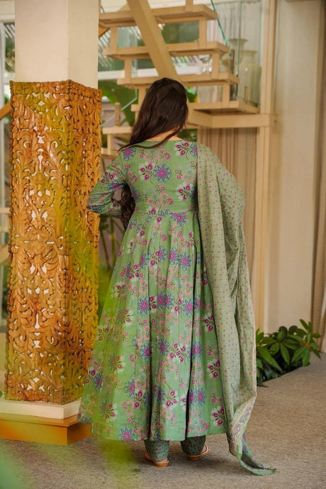 Green Floral Printed Cotton Blend Anarkali Suits (ACA6851)