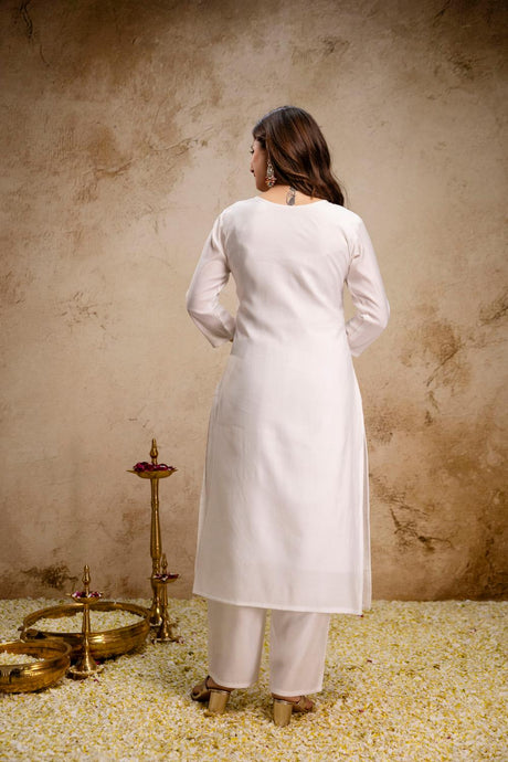Off White Floral Embroidered Silk Kurti Pant Set (ACA6863)