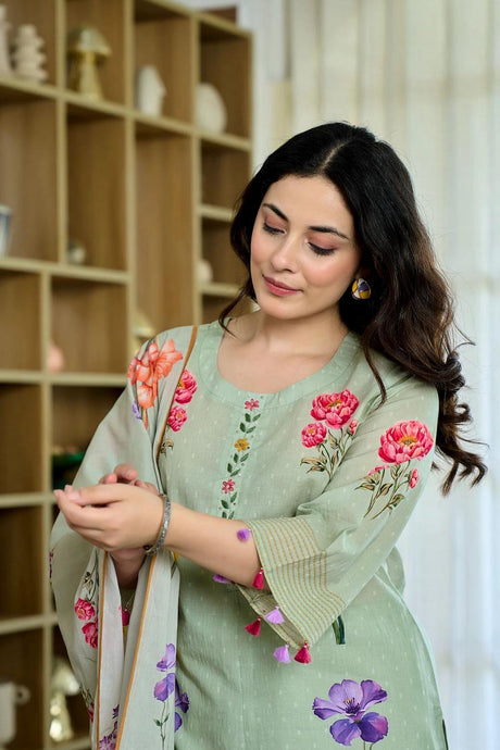 Green Floral Printed Chanderi Kurti Pant Set (ACA6865)