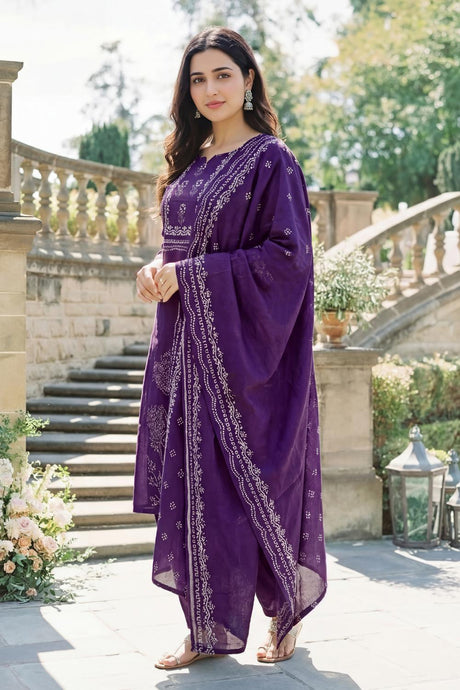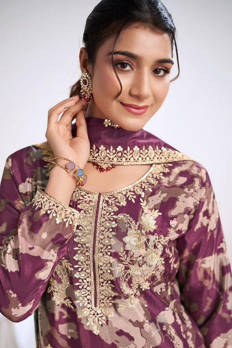 Violet Floral Embroidered Art Silk Palazzo Suit (Vega Gulkayra Niru - 7546-E)