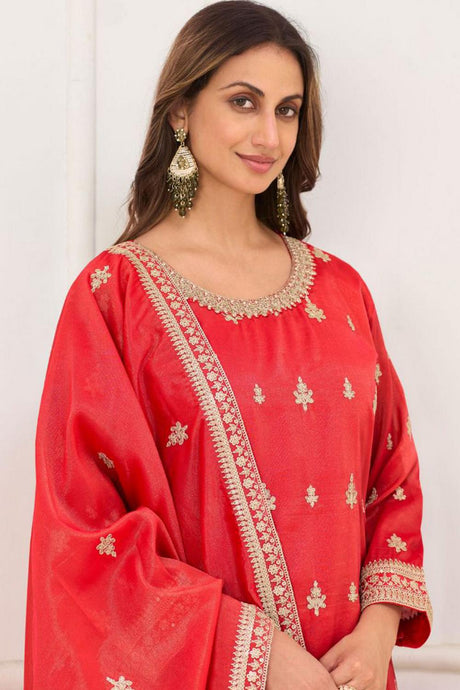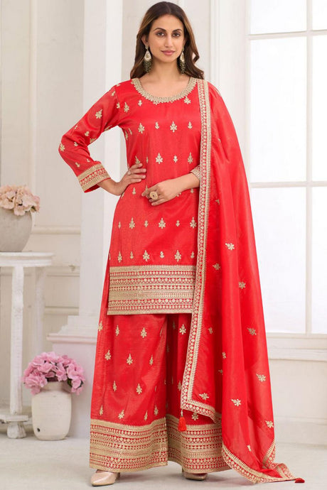 Red Floral Embroidered Art Silk Palazzo Suit (Vega Radha Zeel - 5043)