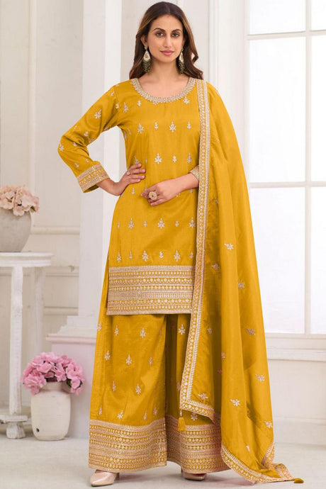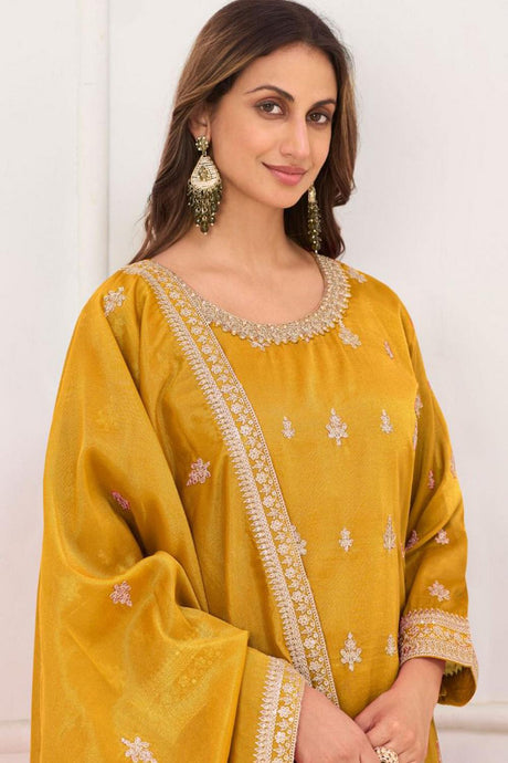 Yellow Floral Embroidered Art Silk Palazzo Suit (Vega Gulkayra Niru - 7546-B)