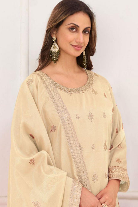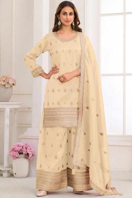 Cream Floral Embroidered Art Silk Palazzo Suit (Vega Gulkayra Niru - 7546-C)