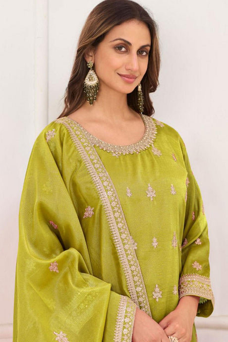 Olive Green Embroidered Chinon Palazzo Suit (ACA6800)