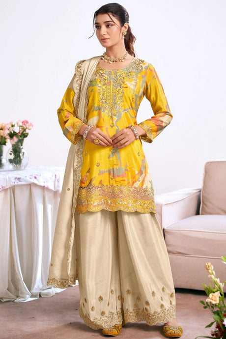 Yellow Floral Embroidered Art Silk Palazzo Suit (Vega Radha Zeel - 5042)