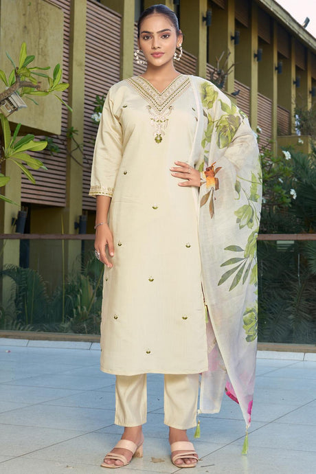 Cream Floral Embroidered Silk Straight Cut Suit (VT-2520)