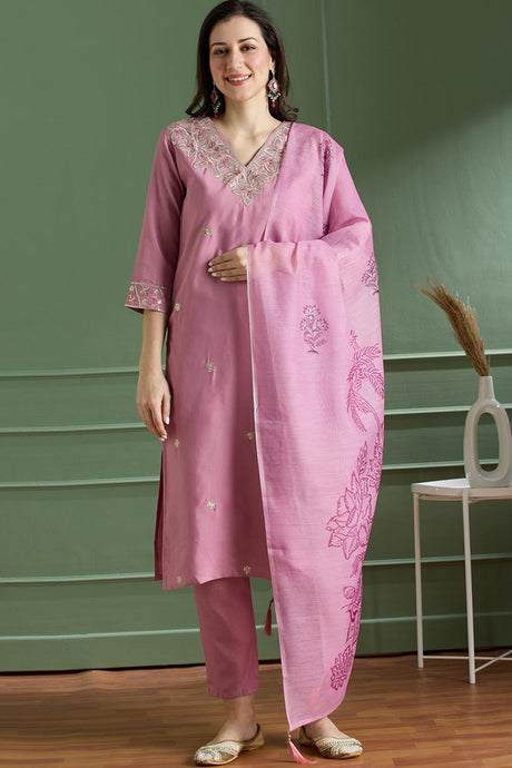 Pink Floral Embroidered Silk Straight Cut Suit (VT-2522)