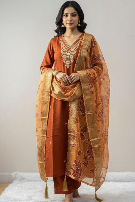 Orange Floral Embroidered Silk Straight Cut Suit (VT-2521)